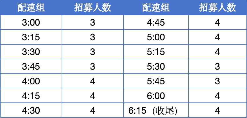 300配速组成绩高于申请组别成绩10分钟以上;315、330、345配速组高于申请组别成绩15分钟以上;其他配速组成绩高于申请组别成绩20分钟以上(以上申请均需提供一年内达到该成绩段内的赛事成绩证明),服从配速统一安排。
