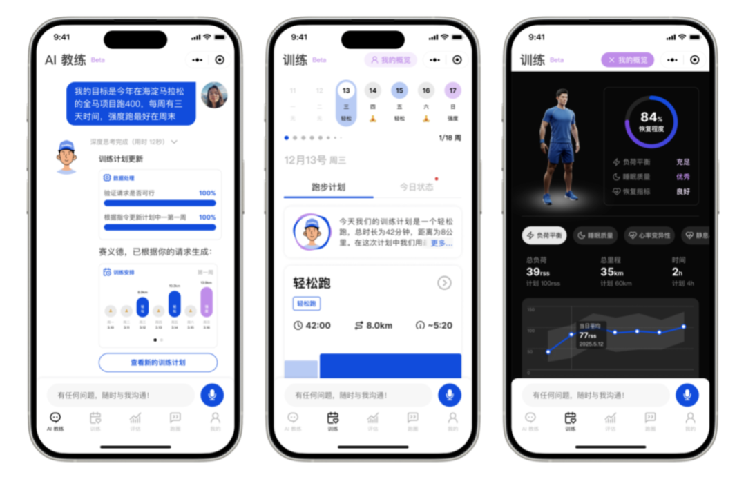 为本届赛事提供科技赋能的PaceMate,融合了多项智能算法与训练原理,能够像真人教练一样,首先对你的身体状态、跑力基础等进行评估,再结合训练节奏、疲劳度及赛事目标等,为你生成个性化的训练“活计划”,拒绝“一套计划万人用”。在训练周期内,你还可以通过语音实时交互与AI教练对话,AI教练将会根据你的反馈即时调整方案,同步生成最新训练计划,真正“计划随你而动”。就像一位24小时在线的私人跑步教练,始终为你提供科学、贴心的训练指导。