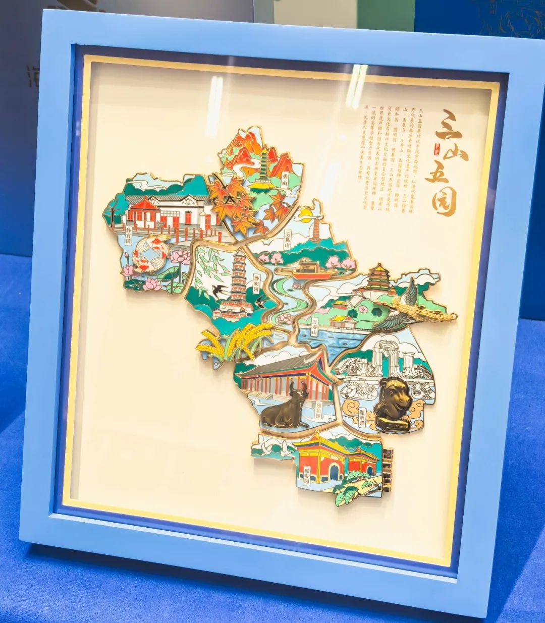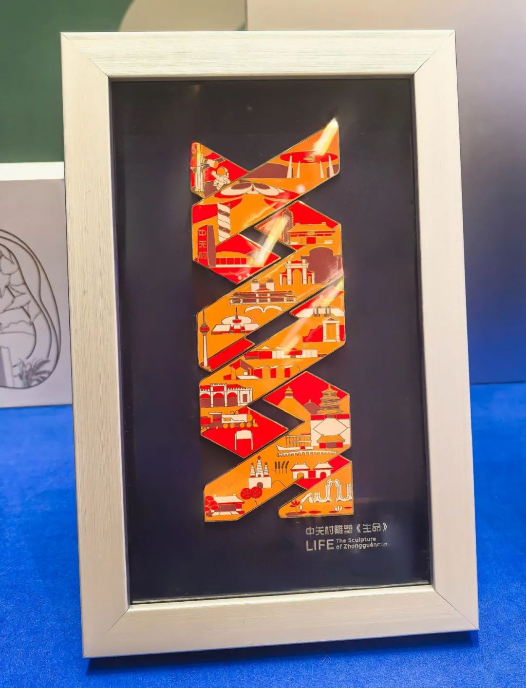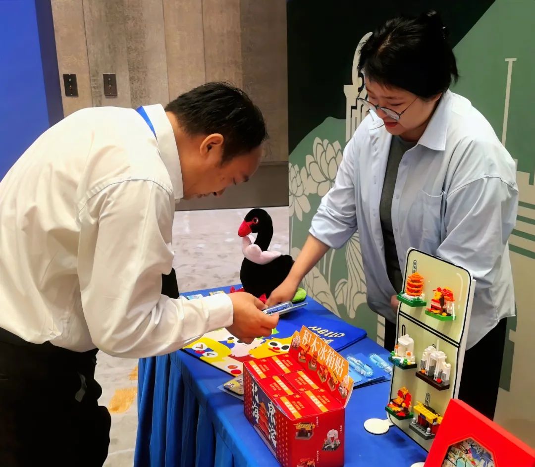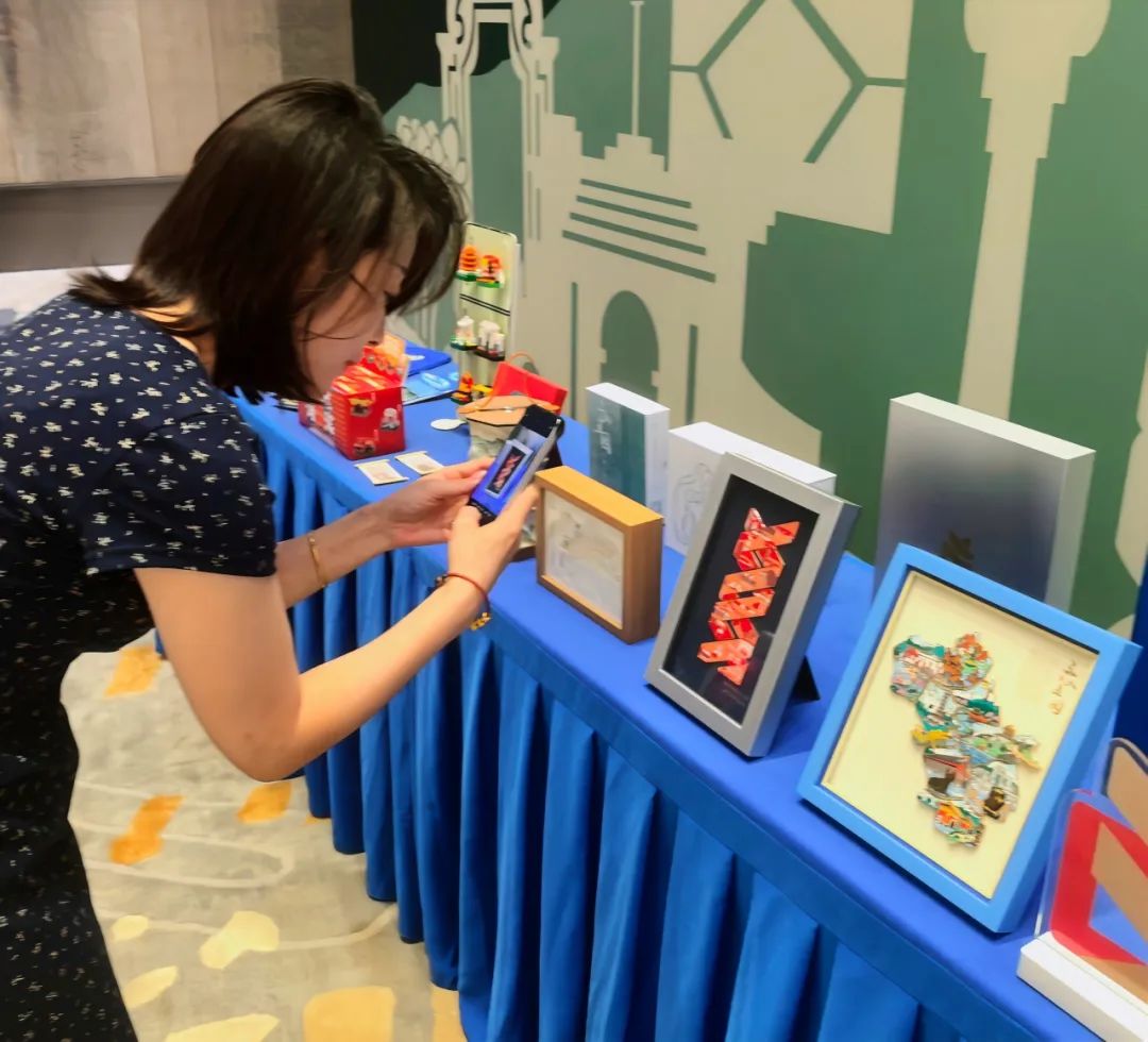 展位前,“双螺旋组合徽章”“三山五园徽章套装”“西山天际线纸雕灯”等明星产品吸引与会者驻足流连。参会嘉宾与媒体记者或俯身端详纹路细节,或举起手机记录设计巧思,在工作人员的讲解中深入感受产品背后的文化叙事。