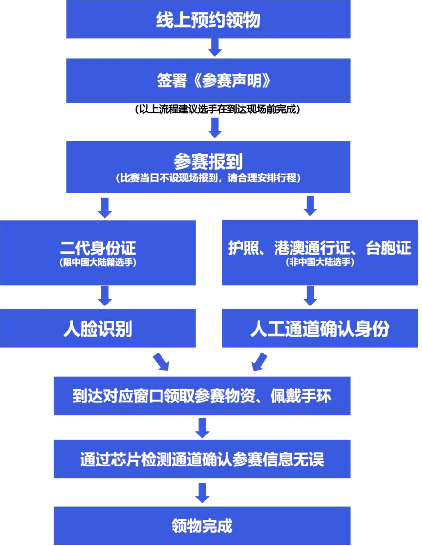 无法提供身份证原件的参赛选手,可凭其他有效身份证明经人工通道进行身份核验,经核验并确认报名信息无误后,可正常领取参赛物品。